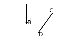 Hai thanh ray nằm ngang, song song và cách nhau 20 cm đặt trong từ trường đều, thẳng đứng, hướng xuống, B = 0,4 T. Một thanh kim loại CD có khối lượng 200 g đặt trên ray và vuông góc với ray. Cho hệ số ma sát giữa CD và 2 thanh ray là 0,1, lấy \(g = 10\,\,m/{s^2}\).