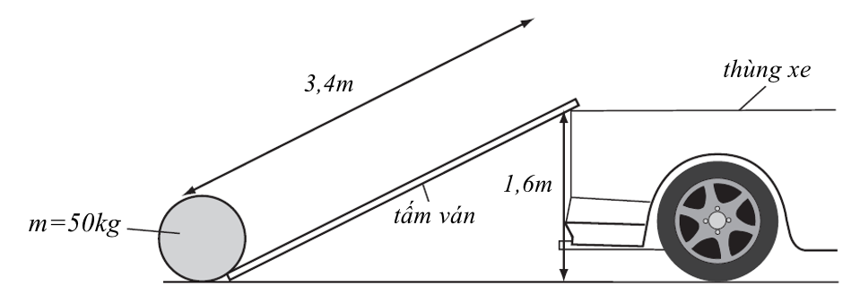 Một thùng có khối lượng 50 kg được chất lên thùng sau của một chiếc xe tải cao 1,6 m bằng