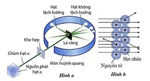 Trong thí nghiệm tán xạ hạt α, chùm hat α có động năng lớn phát ra từ nguồn phóng xạ được bắn vào lá vàng mỏng như hình a. Kết quả cho thấy hầu hết các hạt α đi thẳng nhưng có một số ít hạt bị lệch so với hưởng truyền ban đầu (bị tán xạ) với các góc lệch khác nhau như hình b.