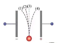 Hình bên là sự lệch của các tia phóng xạ \(\alpha ;\gamma ;{\beta ^ + };{\beta ^ - }\)trong điện trường giữa hai bản kim loại song song tích điện trái dấu. Các tia phóng xạ (1), (2), (3), (4) tương ứng là