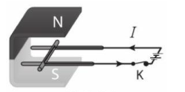 Thanh kim loại dẫn điện có thể lăn không ma sát dọc theo hai đoạn dây dẫn không nhiễm từ (Hình vẽ). Khi đóng công tắc K, dòng điện chạy theo chiều mũi tên, lúc này thanh kim loại sẽ: