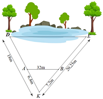 Bạn An đo được khoảng cách từ vị trí mình đứng (điểm \(K\)) đến cây \(D\) và cây \(E\) ở hai bên hồ nước lần lượt là \(KD = 18\;m\) và \(KE = 20,25\;m\). Để tính độ dài \(DE,\) An xác định điểm \(A\) nằm giữa \(K,D\) và điểm \(E\) nằm giữa \(K,E\) sao cho \(KA = 6,4m,\,\,KB = 7,2m\) và khoảng cách giữa A và B là 32 m.
