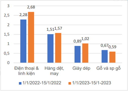 Biểu đồ cột kép ở hình bên biểu diễn trị giá xuất khẩu lớn của các mặt hàng điện thoại và linh kiện; hàng dệt, may; Giày dép; Gỗ và sp gỗ trong 15 ngày đầu năm 2023 và cùng kỳ năm 2022. (Nguồn : Tổng cục hải quan)