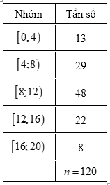Cho bảng số liệu ghép nhóm như sau:Giá trị đại diện của nhóm \(\left[ {12,16} \right]\)