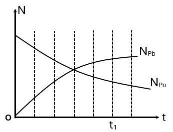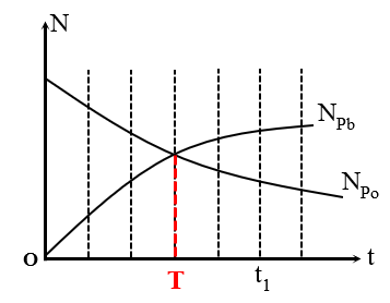 Đồng vị \({}_{84}^{210}Po\) phóng xạ \(\alpha \) và biến thành hạt nhân chì \({}^{210}Pb\) bền. Hình bên là đồ thị biểu diễn sự thay đổi số hạt nhân Pôlôni (P0) và số hạt nhân chì (NPb) theo thời gian t. Tỉ số khối lượng của hạt nhân chì so với hạt nhân Pôlôni vào thời điểm \({t_2} = 2.{t_1}\) gần bằng