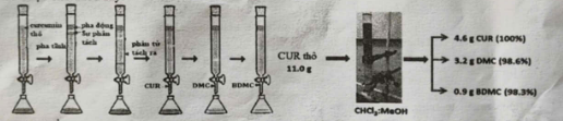 Curcumin được tách ra từ củ nghệ bằng phương pháp chiết và kết tinh là curcumin thô. Trong curcumin thô có chứa ba loại curcuminoid là curcumin (CUR), demethoxycurmin (DMC) và bisdemethoxycurcumin (BDMC). Từ curcumin thô có thể tách riêng 3 loại trên bằng phương pháp sắc kí cột với pha tĩnh là silica gel và pha động là hỗn hợp chloroform và methanol. Sơ đồ tách và độ tinh khiết của ba loại curminoid tách ra từ một mẫu được cho dưới đây: