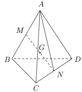 Cho tứ diện \(ABCD\). Gọi \(M,\,\,N\) lần lượt là trung điểm của \(AB,\,\,CD;\,\,G\) là trung điểm
