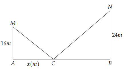 Có hai cây cột, một cây cao 16m và một cây cao 24m đứng cách nhau 30m.