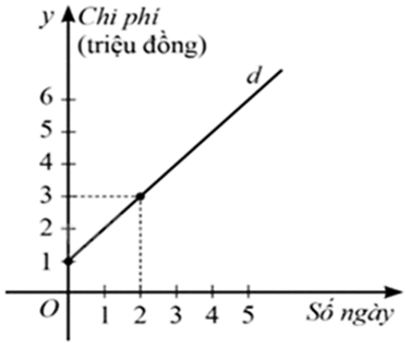Để sử dụng thẻ dịch vụ nghỉ dưỡng 5 sao ở bãi biển Nha Trang của một công ty du lịch, khách hàng phải trả phí thuê theo ngày và một khoản phí ban đầu gọi là phí duy trì thẻ. Một phần đường thẳng d ở hình sau biểu thị tổng chi phí (đơn vị: triệu đồng) mà khách hàng đó phài trả để sử dụng dịch vụ của công ty du lịch theo thời gian nghỉ dưỡng (đơn vị: ngày). Giả sử hàm số \(y = ax + b\,\,(a \ne 0)\) có đồ thị của hàm số là đường thẳng \(d.\)