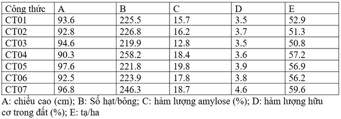 Một số chỉ tiêu thống kê được ghi lại trong bảng sau khi kết thúc vụ lúa sử dụng các công thức phân bón.