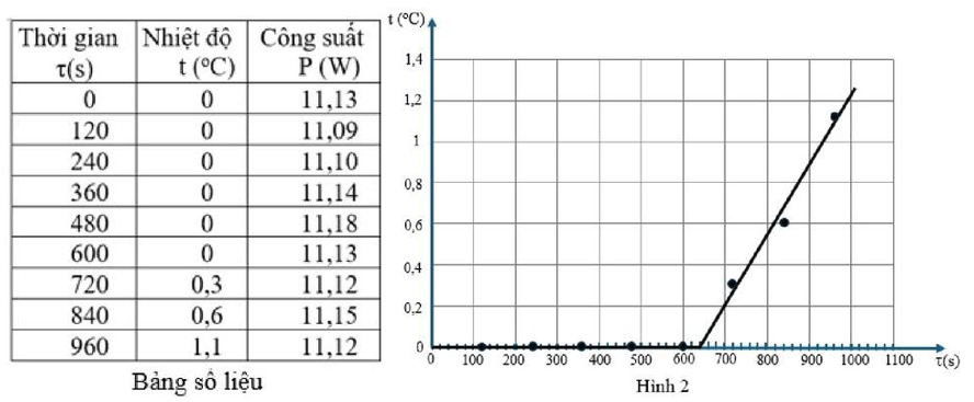Khi tiến hành đo họ khuấy liên tục nước đá, cứ sau mỗi hai phút lại ghi số đo công suất trên oát kế và nhiệt độ trên nhiệt kế. Kết quả đo được ở bảng sau.