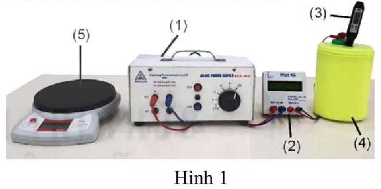 Một nhóm học sinh lớp 12 thực hiện thí nghiệm thực hành đo nhiệt nóng chảy riêng của nước đá. Họ đã lựa chọn bộ dụng cụ thí nghiệm như hình 1 gồm: biến thế nguồn (1), bộ đo công suất nguồn điện có tích hợp chức năng đo thời gian (2), nhiệt kế điện tử có độ phân giải nhiệt độ \(0,{1^0}C\) (3), nhiệt lượng kế bằng nhựa có vỏ xốp kèm dây điện trở (4), cân điện tử (5), các dây nối.