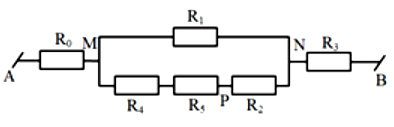 Cho mạch điện như hình vẽ. Biết \({R_0} = 5\,\,\Omega ;\,\,{R_1} = 6\,\,\Omega ;\,\,{R_2} = 18\,\,\Omega ;\,\,{R_3} = {R_5} = 9\,\,\Omega ;\,\,{R_4} = 3\,\,\Omega \). Điện trở tương đương của mạch điện là bao nhiêu \(\Omega \)?