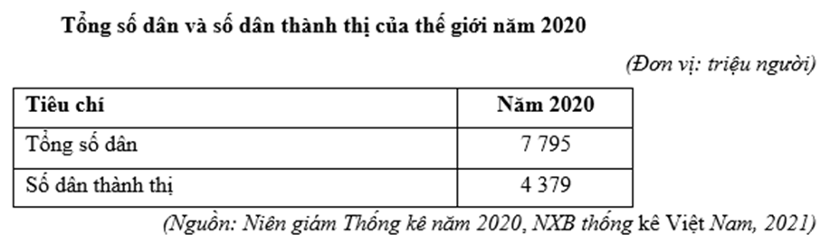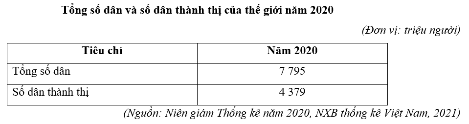 Căn cứ vào bảng số liệu trên, cho biết tỉ lệ dân số thành thị của thế giới năm 2020 là bao nhiêu % (làm tròn kết quả đến một chữ số thập phân).