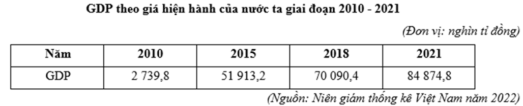 Căn cứ vào bảng số liệu, hãy cho biết tốc độ tăng trưởng GDP của nước ta năm 2021 là bao nhiêu %, coi GDP năm 2010 là 100% (làm tròn kết quả đến hàng đơn vị).