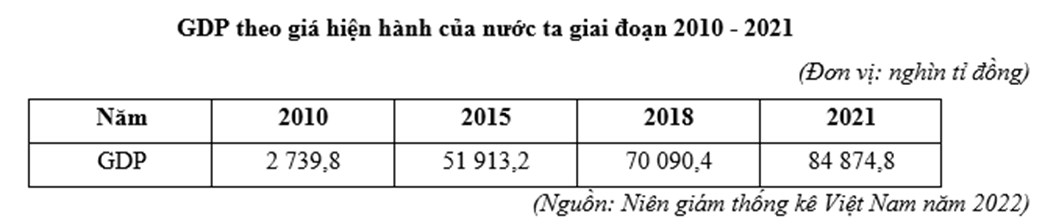 Căn cứ vào bảng số liệu, hãy cho biết tốc độ tăng trưởng GDP của nước ta năm 2021 gấp bao nhiêu lần so với năm 2010 (làm tròn kết quả đến hàng đơn vị).
