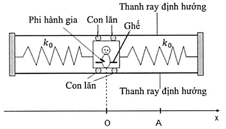 Hình vẽ phác hoạ một thiết bị đo khối lượng của các phi hành gia khi họ̣ làm việc ở điều kiện không trọng lượng trong các trạm vũ trụ. Thiết bị bao gồm một chiếc ghế (tính cả lồng bao bền ngoài) với khối lượng là \({m_0} = 10,0\,\,kg\) được gắn vào giữa hai đầu của hai lò xo nhẹ giống nhau, mỗi lò xo có độ cứng \({k_0} = 380,0\,\,N/m\). Đầu còn lại của mỗi lò xo được gắn cố định vào trạm. Khi ghế cân bằng tại vị trí O, mỗi lò xo bị dãn một đoạn 60,0 cm. Ma sát ở các ổ lăn và ma sát giữa các con lăn với các thanh ray định hướng là không đáng kể. Để đo khối lượng, phi hành gia có khối lượng m ngồi vào ghế. Ghế ngồi cùng phi hành gia được làm lệch khỏi vị tri cân bằng O một đoạn A = 46,0 cm rồi thả không vận tốc ban đầu. Biết rằng chiếc ghế cùng phi hành gia dao động điều hoà quanh O với chu kì đo được là T = 2,0 s. Chọn trục tọa độ Ox như hình vẽ.