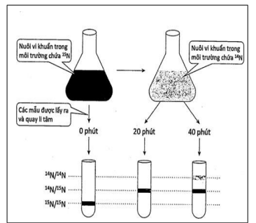 Tại viện công nghệ Califormia, Matthew Meselson và Franklin Stahl đã nuôi cấy tế bào E.coli qua một số thế hệ trong môi trường chứa các nucleotide tiền chất được đánh dấu bằng đồng vị phóng xạ nặng 15N. Các nhà khoa học sau đó chuyển vi khuẩn sang môi trường chỉ chứa đồng vị nhẹ 14N. Sau 20 phút và 40 phút , các mẫu vi khuẩn nuôi cấy được hút ra. Meselson và Stahl có thể phân biệt được các phân tử DNA có tỷ trọng khác nhau bằng phương pháp ly tâm sản phẩm DNA được chiết rút từ vi khuẩn. Biết rằng mỗi vi khuẩn E.coli nhân đôi sau mỗi 20 phút trong môi trường nuôi cấy. ( Hình bên).