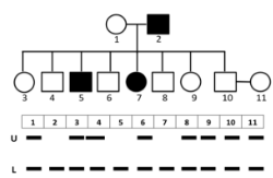 Phả hệ dưới đây cho thấy sự di truyền của một tính trạng bệnh X do 1 gen có 2 alen là U và L trên NST thường quy định. Các số trong bảng dưới phả hệ thể hiện các cá thể (1→11); dấu ngang đậm thể hiện trong kiểu gen có alen tương ứng. Những người (1 → 11) có kiểu gen như dưới phả hệ. Xác suất để cặp vợ chồng số (10) và (11) sinh con trai đầu lòng bị bệnh X là bao nhiêu %? (Hãy thể hiện kết quả bằng số thập phân và làm tròn đến 2 chữ số sau dấu phẩy)