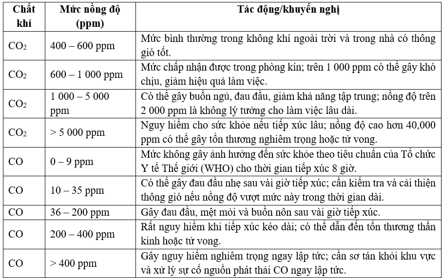 4. Dưới đây là bảng số liệu về nồng độ ppm của khí CO2 và CO được phép trong không gian kín, dựa trên các tiêu chuẩn quốc tế và khuyến nghị về chất lượng không khí: