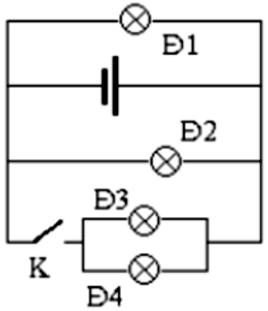 | c) Khi khóa K mở, Đ3 và Đ4 không sáng. | ||