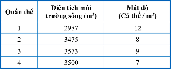Các quần thể của cùng 1 loài có mật độ và diện tích môi trường sống tương ứng như sau: