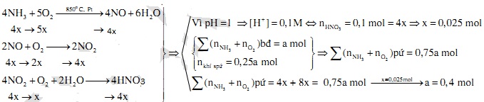 Nung nóng bình kín chứa a mol hỗn hợp NH3 và O2 (xúc tác Pt) để chuyển toàn bộ NH3 thành NO. Làm nguội và thêm nước vào bình, lắc đều thu được 1 lít dung dịch HNO3 có pH = 1, còn lại 0,25a mol khí O2. Biết các phản ứng xảy ra hoàn toàn. Giá trị của a là