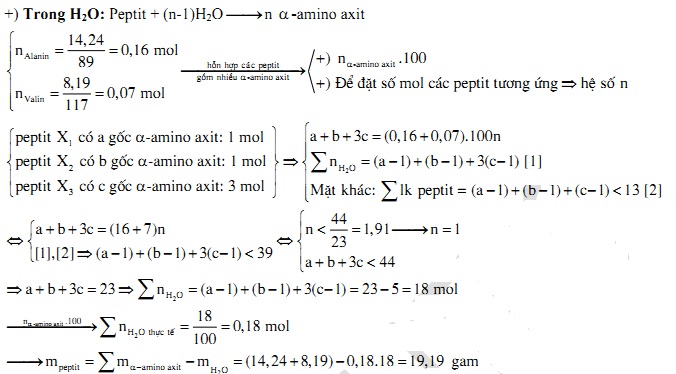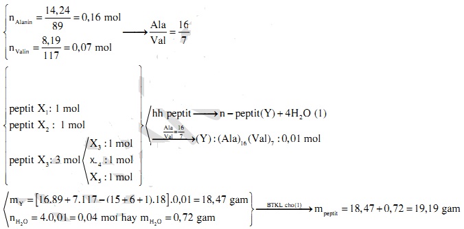 Hỗn hợp X gồm ba peptit đều mạch hở tỉ lệ mol tương ứng là 1 : 1 : 3. Thủy phân hoàn toàn m gam X, thu được hỗn hợp sản phẩm gồm 14,24 gam alanine và 8,19 gam valin. Biết tổng số liên kết peptit trong phân tử của ba peptit trong X nhỏ hơn 13. Giá trị của m là