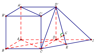 Gọi \(I\) là điểm đối xứng của \(A\) qua \(D\), khi đó \(d\left[ {BD,CD'} \right] = d\left[ {BD,\left( {CD'I} \right)} \right] = d\left[ {D,\left( {CD'I} \right)} \right].\)