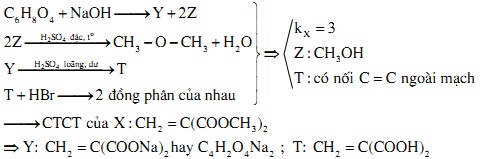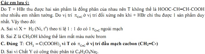Chất X có công thức phân tử C6H8O4. Cho 1 mol chất X phản ứng hết với dụng dịch NaOH, thu được chất Y và 2 mol chất Z. Đun Z với dung dịch H2SO4 đặc, thu được đimetyl ete. Chất Y phản ứng với dung dịch H2SO4 loãng (dư), thu được chất T. Cho T phản ứng với HBr, thu hai sản phẩm là đồng phân cấu tạo của nhau. Phát biểu nào sau đây đúng?