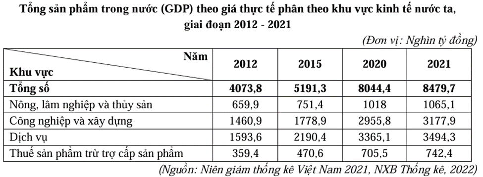 | d) Biểu đồ cột là dạng biểu đồ thích hợp nhất để thể hiện quy mô GDP phân theo khu vực kinh tế nước ta, giai đoạn 2012 - 2021. |