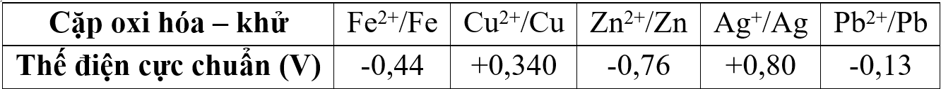 Cho bảng giá trị thế điện cực chuẩn của các cặp oxi hóa – khử như sauTrong các ion kim loại
