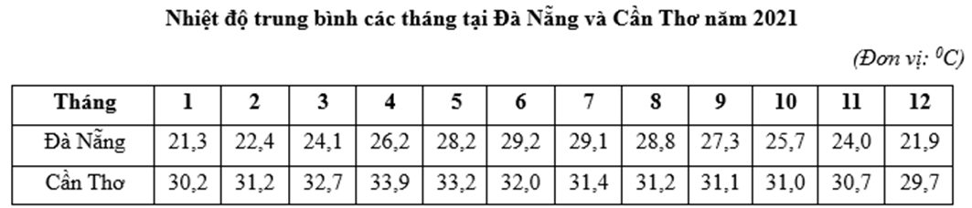 Căn cứ vào bảng số liệu trên, hãy cho biết sự chênh lệnh giữa biên độ nhiệt độ năm của Đà Nẵng với biên độ nhiệt độ năm của Cần Thơ là bao nhiêu 0C (làm tròn kết quả đến hàng đơn vị).