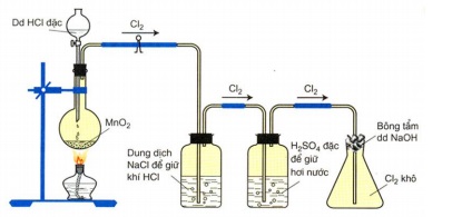 Cho hình vẽ mô tả thí nghiệm điều chế khí Cl2 từ MnO2 và dung dịch HCl: Khí Cl2 sinh ra thường