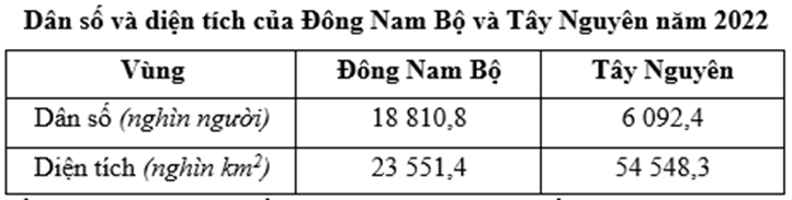 Căn cứ vào bảng số liệu trên, hãy cho biết năm 2022, mật độ dân số của Đông Nam Bộ gấp bao nhiêu lần mật độ dân số của Tây Nguyên (làm tròn kết quả đến hàng đơn vị).
