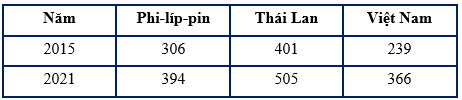 Cho bảng số liệu về quy mô GDP của một số quốc gia Đông Nam Á năm 2015 và năm 2021 (Đơn vị: Tỉ USD)