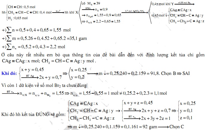 Một bình kín chỉ chứa các chất sau: axetilen (0,5 mol), vinylaxetilen (0,4 mol), hiđro (0,65 mol) và một ít bột niken. Nung nóng bình một thời gian, thu được hồn hợp khí X có tỉ khối so với H2 bằng 19,5. Khí X phản ứng vừa đủ với 0,7 mol AgNO3 trong dung dịch NH3, thu được m gam kết tủa và 10,08 lít hỗn hợp khí Y (đktc). Khí Y phản ứng tối đa với 0,55 mol Br2 trong dung dịch. Giá trị của m là