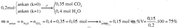Đốt cháy hoàn toàn 0,2 mol hỗn hợp X gồm một ankan và một anken, thu được 0,35 mol CO2 và 0,4 mol H2O. Phần trăm số mol của anken trong X là