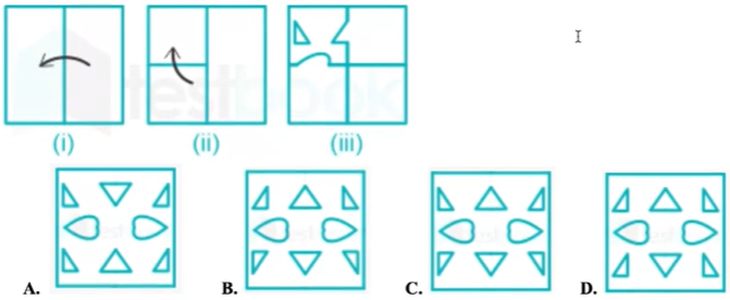 The sequence of folding a piece of paper (figure i and ii) and the manner in which the folded paper has been cut (figure iii) is shown in the following figures. Select the option that would most closely resemble the unfolded form of figure (iii).