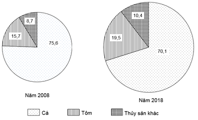 Theo biểu đồ, nhận xét nào sau đây đúng về sự thay đổi tỉ trọng trong cơ cấu sản lượng thủy sản nuôi trồng của nước ta năm 2018 so với năm 2008?