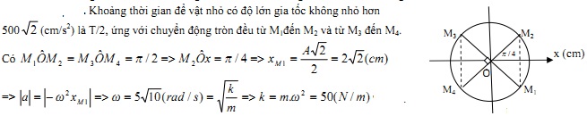 Vật nhỏ có khối lượng 200 g trong một con lắc lò xo dao động điều hòa vớỉ chu kì T và biên độ 4 cm. Biết trong một chu kì, khoảng thòi gian để vật nhỏ có độ lớn gia tốc không nhỏ hơn 500√2 cm/s2 là T/2. Độ cứng của lò xo là