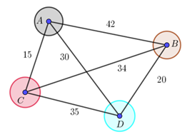 Trường THPT A tổ chức chuyến đi về nguồn cho học sinh tham quan 4 địa điểm A, B, C, D; Thời gian (đơn vị: phút) di chuyển qua lại giữa các điểm tham quan được mô tả ở hình bên. Đoàn học sinh của trường sẽ tham quan một địa điểm nào đó đầu tiên, rồi đi qua tất cả các địa điểm còn lại, mỗi khi đã tham quan địa điểm nào rồi thì sẽ không quay lại đó nữa nhưng phải về địa điểm ban đầu để trở về. Hỏi tổng thời gian tham quan các địa điểm thỏa mãn điều kiện trên nhận giá trị nhỏ nhất là bao nhiêu?