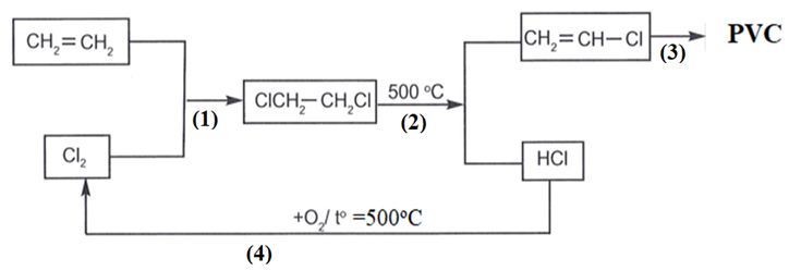 Poly(vinyl chloride) (PVC) là một chất dẻo có tính cách điện tốt, không thấm nước, bền với acid vì vậy nó được dùng để sản xuất vật liệu cách điện, ống dẫn nước,…Khi đun nóng, PVC mềm ra rồi nóng chảy và khi để nguội nó lại đóng rắn. Hiện nay, trong công nghiệp sản xuất PVC người ta đi từ nguyên liệu là khí ethylene và chlorine. Quy trình sản xuất thực hiện theo sơ đồ khép kín như sau: