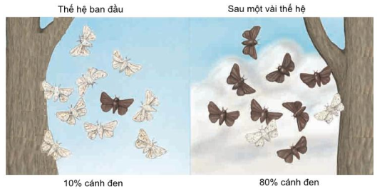 Người ta tiến hành thí nghiệm: Thả 500 con bướm thuộc loài Biston betularia (có khoảng 50 con bướm cánh đen) vào rừng cây bạch dương trồng trong vùng bị ô nhiễm (thân cây có màu xám đen do môi trường ô nhiễm). Sau 1 thời gian, người ta tiến hành bắt lại các con bướm. Theo tính toán có khoảng 80% cánh đen.