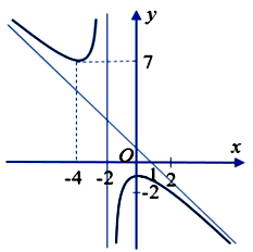Cho hàm số \(y = f\left( x \right) = \dfrac{{a{x^2} + bx + c}}{{x + d}}\) có đồ thị là đường cong như hình vẽ dưới đây, biết đường tiệm xiên của đồ thị hàm số đi qua hai điểm \(\left( {0;1} \right)\) và \(\left( {1;0} \right)\).