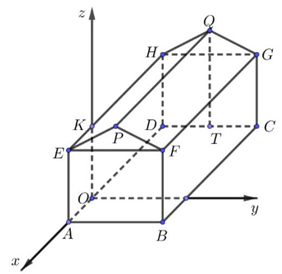 Một kho chứa hàng có dạng hình lăng trụ đứng \(ABFPE.DCGQH\) với \(ABFE\) là hình chữ nhật và \(EFP\) là tam giác cân tại \(P\). Gọi \(T\) là trung điểm của \(DC\). Các kích thước của kho chứa lần lượt là \(AB = 6{\rm{\;m}};AE = 5{\rm{\;m}};AD = 8{\rm{\;m}};QT = 7{\rm{\;m}}\). Người ta mô hình hoá nhà kho bằng cách chọn hệ trục toạ độ có gốc toạ độ là điểm \(O\) thuộc đoạn \(AD\) sao cho \(OA = 2{\rm{\;m}}\) và các trục toạ độ tương ứng như hình vẽ dưới đây. Khi đó: