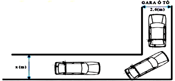 Đoạn đường đầu tiên có chiều rộng bằng \(x\left( m \right)\), đoạn đường thẳng vào cổng GARA có chiều rộng \(2,6\left( m \right)\). Biết kích thước xe ôtô là \(5m \times 1,9m\) (chiều dài x chiều rộng). Để tính toán và thiết kế đường đi cho ôtô người ta coi ôtô như một khối hộp chữ nhật có kích thước chiều dài là \(5\left( {{\rm{\;m}}} \right)\), chiều rộng \(1,9\left( m \right)\). Tìm chiều rộng nhỏ nhất của đoạn đường đầu tiên để ôtô có thể đi vào GARA được? (Làm tròn kết quả đến hàng phần muời; giả thiết ôtô không đi ra ngài đuờng, không đi nghiêng và ôtô không bị biến dạng).