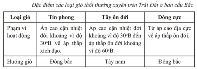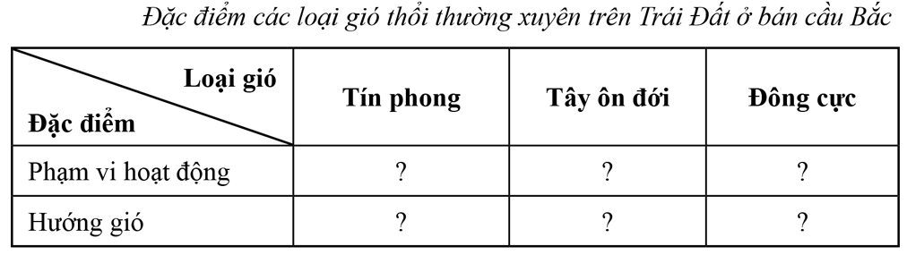 Hoàn thành bảng thông tin về đặc điểm của các loại gió thổi thường xuyên trên Trái Đất