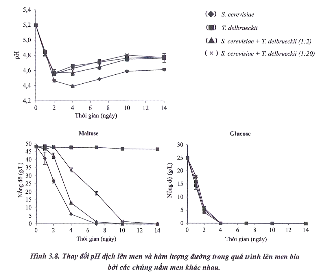 Việc sản xuất hầu hết các loại bia thương mại dựa vào quá trình lên men đơn chủng nấm men Saccharomyces cerevisiae (S. cerevisiae) hoặc Saccharomyces pastorianus (S. pastorianus). Tuy nhiên, quá trình lên men hỗn hợp hai hay nhiều chủng vẫn được áp dụng với một số loại bia đặc biệt nhằm tận dụng tính ưu việt của từng chủng. Ngoài nấm men thuộc chi Saccharomyces, một số nghiên cứu còn chỉ ra việc kết hợp với nấm men Torulaspora delbrueckii (T. delbrueckii) cũng đem lại nhiều hiệu quả cho sản phẩm. Nghiên cứu dưới đây tiến hành bốn thí nghiệm gồm: lên men đơn chủng S. cerevisiae, lên men đơn chủng T. delbrueckii, lên men kết hợp S. cerevisiae và T. delbrueckii tỷ lệ 1 : 2 và lên men kết hợp S. cerevisiae và T. delbrueckii tỷ lệ 1 : 20. Quá trình lên men được thực hiện ở 20oC trong 14 ngày. Sự thay đổi nồng độ của các loại đường và pH dịch lên men được theo dõi trong thời gian trên và biểu diễn ở hình 3.8. Kết thúc quá trình lên men, bia lên men kết hợp hai chủng có hàm lượng các ester tạo mùi: ethyl octanoate, ethyl decanoate, ethyl dodecanoate và citronellyl acetate cao hơn đáng kể khi so với bia lên men đơn chủng.