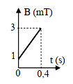Một khung dây cứng, phẳng, diện tích 25 cm2 gồm 10 vòng dây dẫn, đặt trong từ trường đều, mặt phẳng khung vuông góc với các đường sức từ. Độ lớn cảm ứng từ biến thiên theo thời gian như đồ thị bên. Suất điện động cảm ứng xuất hiện ở khung trong 0,4 s đầu tiên có giá trị